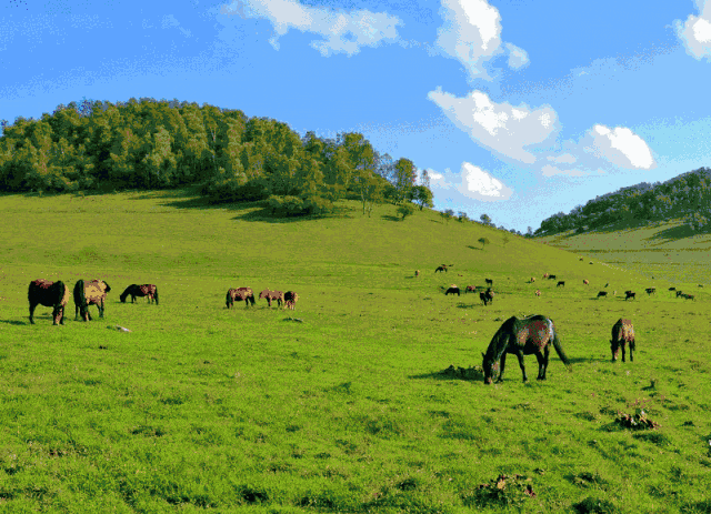 这里的草原从不是单调的绿毯。风过时,连片的草浪层层叠叠涌向远方,带着初秋特有的干爽气息,掠过鼻尖时,还能嗅到草叶晾晒后的清甜。成群的牛羊缓缓移动,仿佛流动的音符,在广袤的绿野间谱写出鲜活的乐章,一举一动都为这片土地注入生机,与静谧的森林、舒展的草原共同勾勒出一幅动静相宜的天然画卷。
