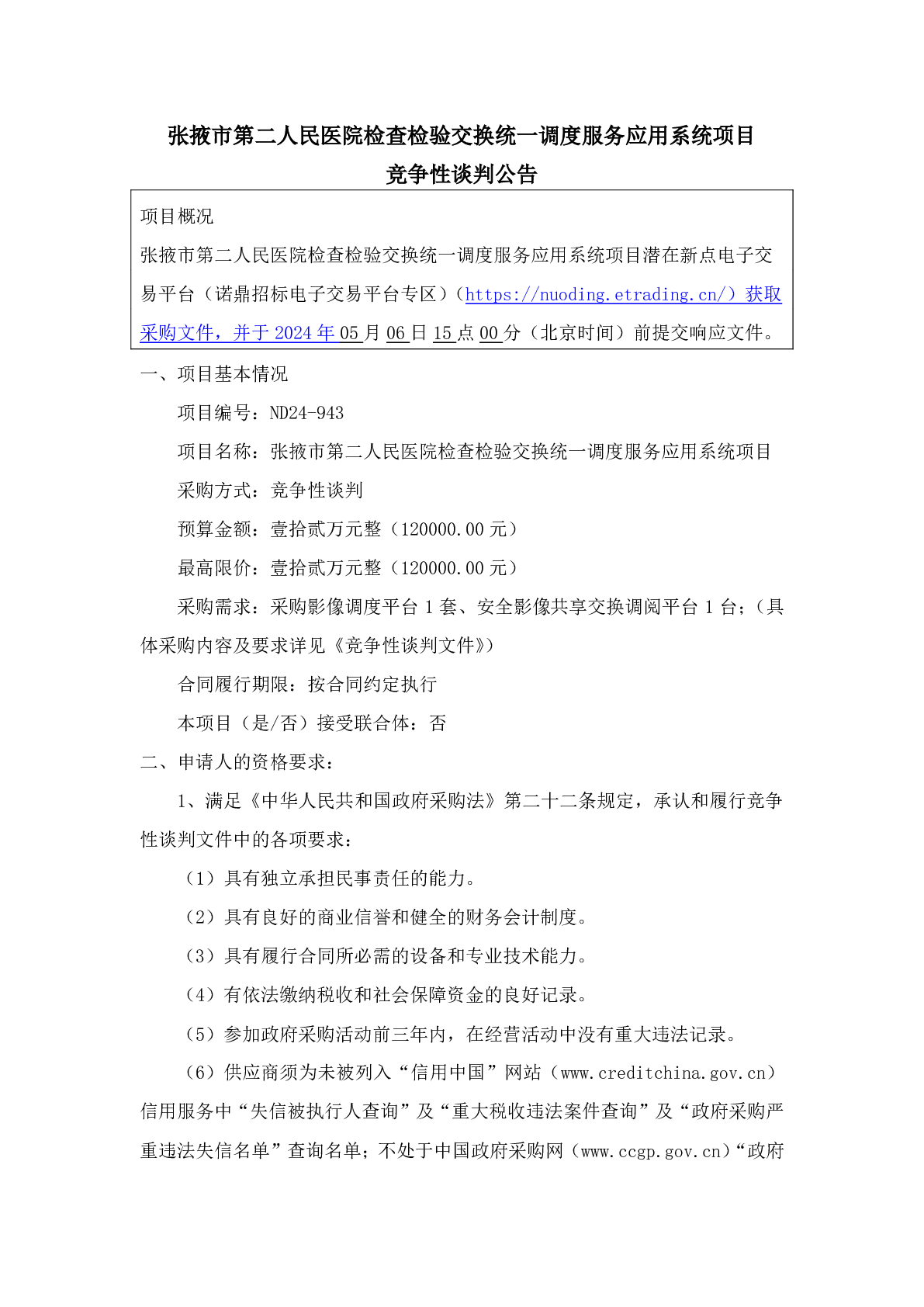张掖市第二人民医院检查检验交换统一调度服务应用系统项目竞争性谈判公告