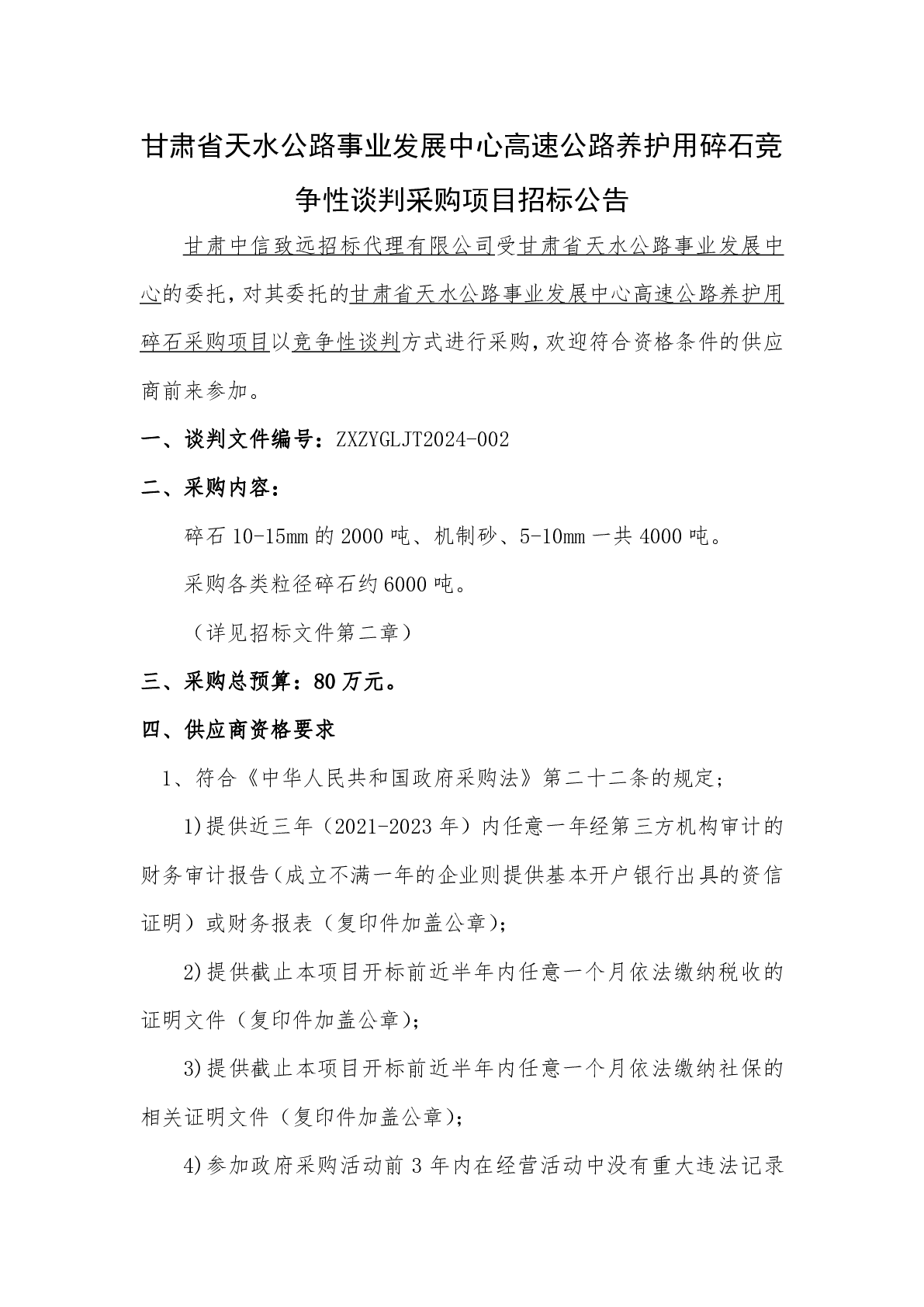 甘肃省天水公路事业发展中心高速公路养护用碎石竞争性谈判采购项目招标公告