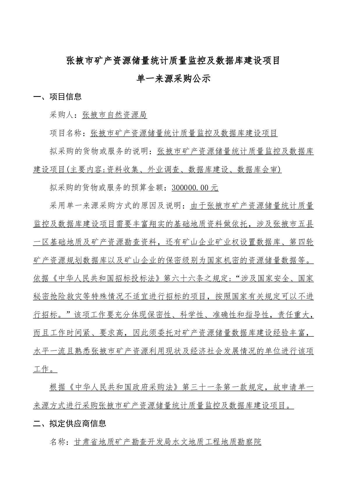张掖市矿产资源储量统计质量监控及数据库建设项目单一来源采购公示