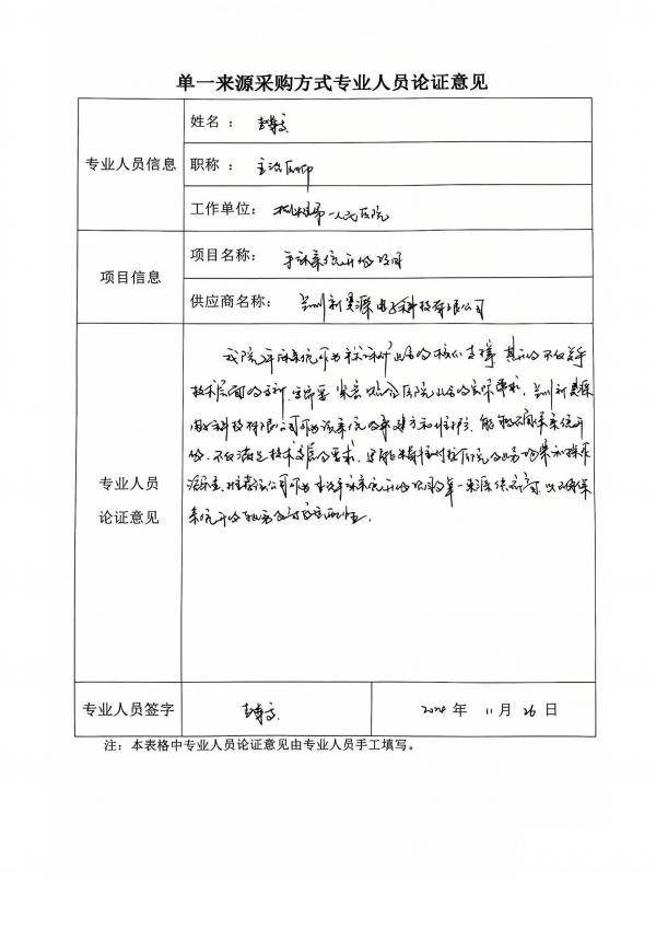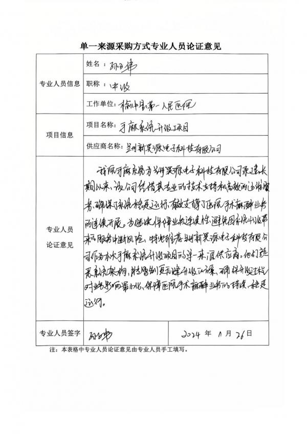 采用单一来源采购方式的原因及说明:医院手麻系统作为手术麻醉业务的核心支撑,承载着大量的医疗数据,兰州新昊源电子科技有限公司作为该系统的承建方和维护方,为保证业务连续性,避免因系统升级带来的服务中断风险,依据《榆中县第一人民医院采购管理内部控制制度(试行)》第五十四条之规定,采用院内单一来源采购方式,拟推荐兰州新昊源电子科技有限公司为本项目单一来源供应商。