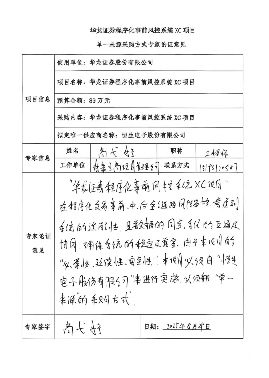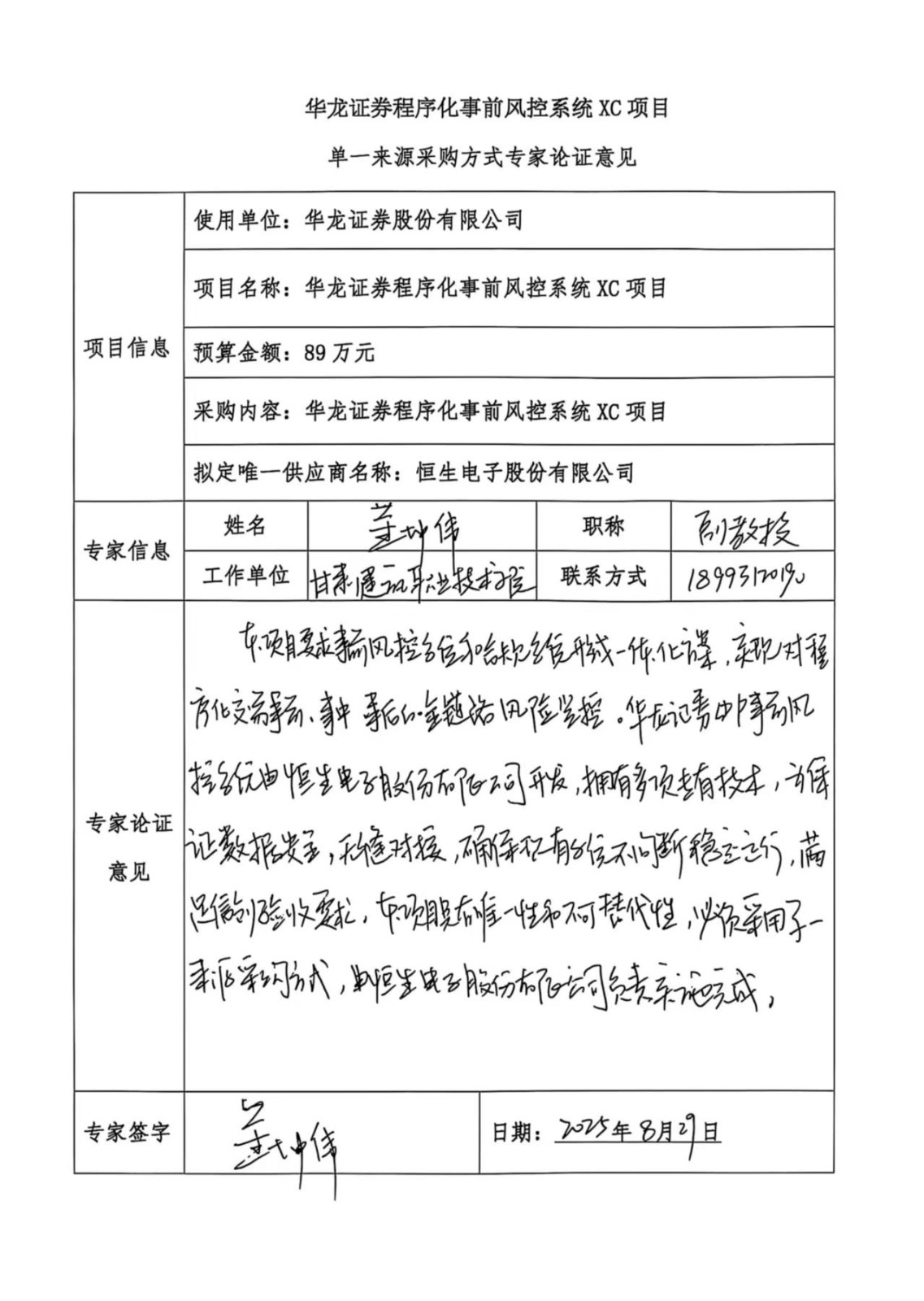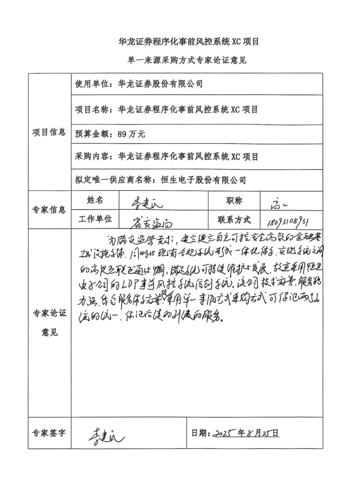 根据以上特点,我公司拟进行单一来源方式采购恒生电子股份有限公司下的LDP事前风控系统信创系统,以进一步完善、提升华龙证券合规管理体系的建设。
