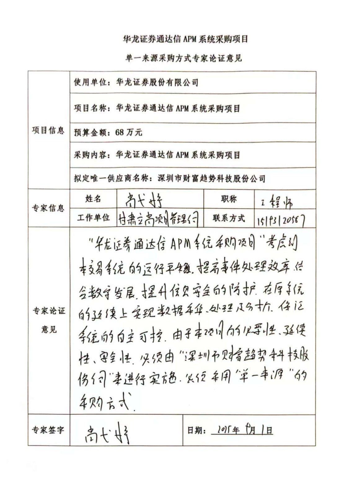 (六)拟定的唯一供应商:深圳市财富趋势科技股份公司