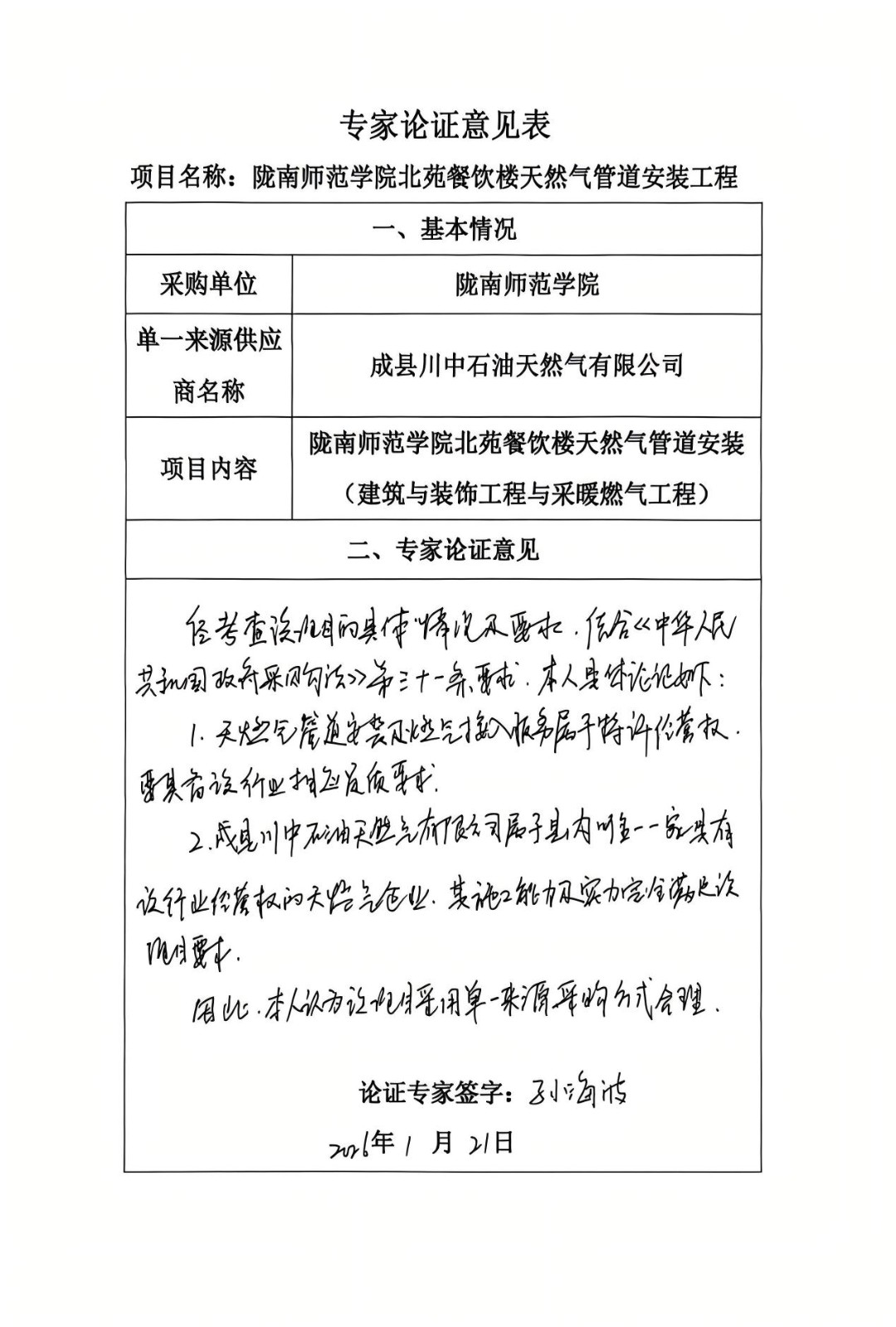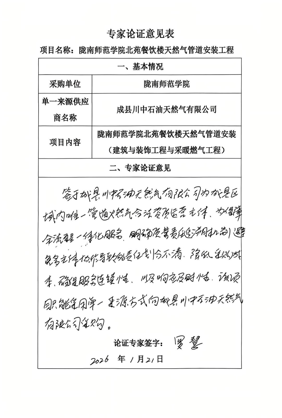 5、采用单一来源采购方式的原因及说明:经核查项目技术文件、地方行业管理规定及市场供给情况,该项目符合《中华人民共和国政府采购法》第三十一条第(一)款“只能从唯一供应商处采购” 的法定情形,天然气管道安装及燃气接入服务属于公共服务类项目,根据陇南市人民政府关于管道燃气特许经营的相关批复,成县川中石油天然气有限公司已依法取得项目所在地管道燃气特许经营权,特许经营期限内为该区域唯一合法的管道燃气供应商。项目所需的气源接入、管网规划、安全监管等核心服务均依赖特许经营权载体,其他市场主体无合法资质开展此类业务。