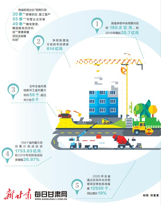 同时,省发展改革委成立抓项目稳投资工作专班,编印重点投资项目、省列重大项目、重大前期项目“三个清单”,以及“两新一重”项目储备清单,共纳入新开工、续建、预备等各阶段投资项目7000多个,总投资约5万亿元,为全省投资稳定增长提供可持续动力。去年,我省争取中央预算内投资180.8亿元,较2019年增加20.7亿元,争取新增地方政府专项债券614亿元,争取的资金额度和增加幅度均为历年之最。开展政银企对接暨百名行长联千家企业推进行动,向银行推送了第四批、第五批补短板重大项目233个,获得银行贷款金额66.5亿元。依托“甘肃信易贷”搭建全省融资平台,开创新的投融资模式,将政府投资和社会融资有机结合,为重大项目建设提供资金保障。去年全省共落地新开工省列重大项目56个,超过年计划6个。158个省列重大项目累计完成投资1753.63亿元,较2019年实际完成投资增幅26.97%。