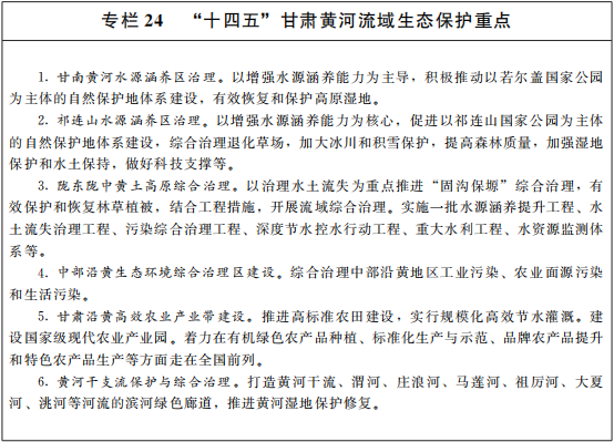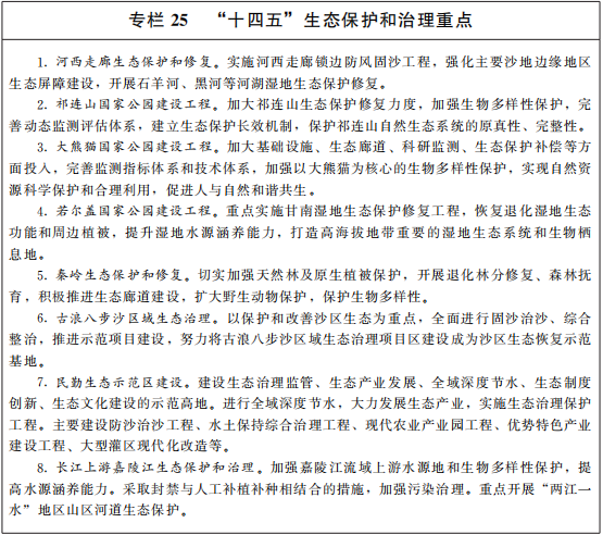 全面改善祁连山生态。开展祁连山及沿山地区山水林田湖草沙综合治理。加强林草植被建设,提高林草覆盖率,减少水土流失。实施沙化土地封禁保护、固沙防沙治沙工程,构建河西走廊荒漠化、沙化综合防控体系。建立野生动物监测体系,加大濒危物种及其栖息地保护,保护生物多样性。对祁连山核心区采取自然休养、减畜禁牧等措施,引导超载人口有序转移,减少人为扰动,减轻自然生态系统承载压力,提升生态自我修复功能。强化祁连山矿山生态修复治理,严控水电开发,加强对现有水电设施下泄生态流量监管,依法依规推进旅游开发。实施八步沙区域生态保护与修复,建设民勤生态示范区,加快推进黑河、疏勒河、石羊河等重点流域生态治理与修复。