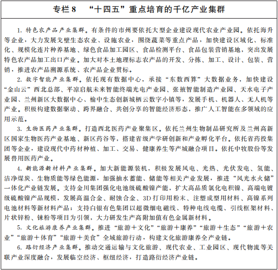 建设创新平台。积极对接国家战略需求,争取构建提升制造业核心竞争力和关键控制力的新平台。加强兰白科技创新改革试验区和兰州白银国家自主创新示范区建设,优化体制机制,完善发展模式,发挥引领示范作用。用好国家中医药产业发展试验区、兰州国家级生物产业基地、敦煌研究院文物领域国家工程中心和重点科研基地、金川集团镍钴资源综合利用国家重点实验室、张掖国家可持续发展议程创新示范区等创新平台。持续夯实原始创新基础,支持兰州建设国家重要的区域创新中心,争取国家重大科研基础设施、同位素实验室、国家镍钴新材料创新示范中心等在甘布局,在生态环境、新材料、装备制造等领域争取国家级创新平台。优化整合一批省级创新平台,布局建设省级实验室和技术创新中心,支持国家级开发区打造创新支撑平台,加快推进国家级科创孵化器建设。深化产学研用合作,建设大学研究院、产学研联盟、产教融合基地等创新平台,提升创新全链条支撑能力。