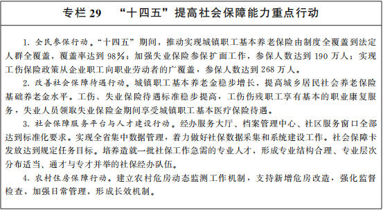 健全多层次社会保障体系。着力扩大各类社会保险覆盖面,努力做到应保尽保。按照覆盖全民、统筹城乡、公平统一、可持续的要求,构建与物价、收入水平相挂钩的社会保障待遇调整机制。配合推进养老保险全国统筹,提升养老保险保障水平。提高基本医疗保险、工伤保险、失业保险统筹能力和层次。建立全省统一的工伤认定、费率调整、待遇支付和劳动能力鉴定制度,提高工伤职工重返工作岗位比例,建立“先康复、后评残”制度。深化医疗保障制度改革,建立重特大疾病保障和救助机制。稳步推进长期护理保险,积极发展商业医疗保险,支持医疗互助有序发展。大力发展职工互助补充保险。大力发展企业年金、职业年金、个人储蓄性养老保险和商业养老保险。科学制定低保标准,兜牢基本生活底线。加快建立多主体供给、多渠道保障、租购并举的住房制度,改革住房公积金制度。统筹完善社会救助、社会福利、慈善事业、优抚安置等制度。保障妇女儿童合法权益,健全老年人、残疾人关爱服务体系和设施。健全退役军人工作体系和保障制度,创新移交安置机制,提升安置质量。提升殡葬服务保障能力。