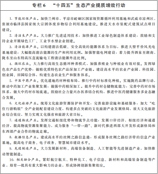 更深层次参与共建“一带一路”。发挥区位优势,从文化、枢纽、技术、信息、生态五个方面深度参与共建“一带一路”,推动对外开放取得更大实质性进展。实施一批文化重大工程,加强文化交流合作,充分发掘历史文化优势,推动甘肃文化走出去和优秀多元文化引进来。集聚各类要素,统筹推进“南向、西进、东出、北扩”四向开放,做大做强枢纽型经济。以兰州白银国家自主创新示范区和丝绸之路国际知识产权港为重点,加快新材料、新能源、生物医药、现代农业、先进制造业等重点领域先进技术的产业化进程,打造知识产权保护、交易高地。加快建设丝绸之路信息港,共建通畅、安全、高效的网络大通道和综合信息服务体系,形成面向中西亚、南亚等地区的信息走廊。探索开展国际环保合作,共建绿色产业合作示范基地。