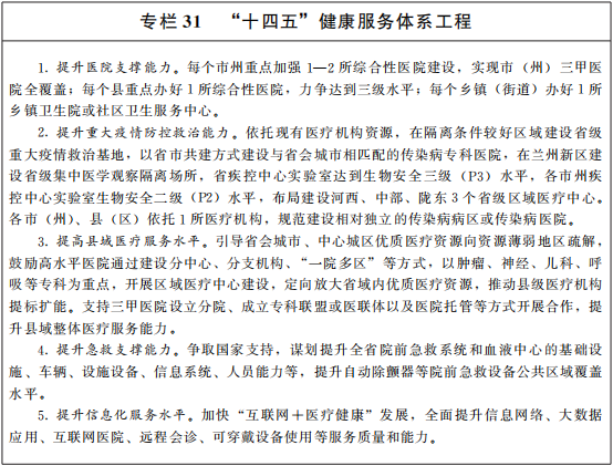 推动健康甘肃建设。坚持党的卫生与健康工作方针,把保障人民健康放在优先发展的战略位置,推进以治病为中心向以人民健康为中心转变。建立稳定的公共卫生事业投入机制。实施健康服务体系建设工程,加强省市县医疗卫生机构体系建设,提升医疗卫生服务能力,提高基础设施、医疗设备和医务人员配置水平,加强公立医院建设和管理考核,不断提高服务质量。改革完善疾病预防控制体系,提高疾控服务能力。提升公立医院传染病救治能力,加强实验室检测网络建设。健全公共卫生应急物资保障体系,强化各级应急医疗物资储备。健全重大疫情防控和公共卫生应急管理体制机制。大力发展中医药和民族医药,推进中医药健康服务多业态融合发展。持续推进“互联网+医疗健康”发展,提升健康教育、慢病管理和残疾康复服务质量,重视精神卫生、心理健康、重点人群管理和职业健康。深入开展爱国卫生运动,促进养成文明健康生活方式。加强公立医院建设和管理考核。完善医保基金总额预算管理。推动构建医疗、医保、医药“三医联动”工作机制。构建高水平全民健身公共服务体系,统筹建设全民健身场地和设施,完善青少年体质健康监测体系,深入开展群众体育活动。提高竞技体育水平,加快建设临洮、白银等高水平体育训练基地。