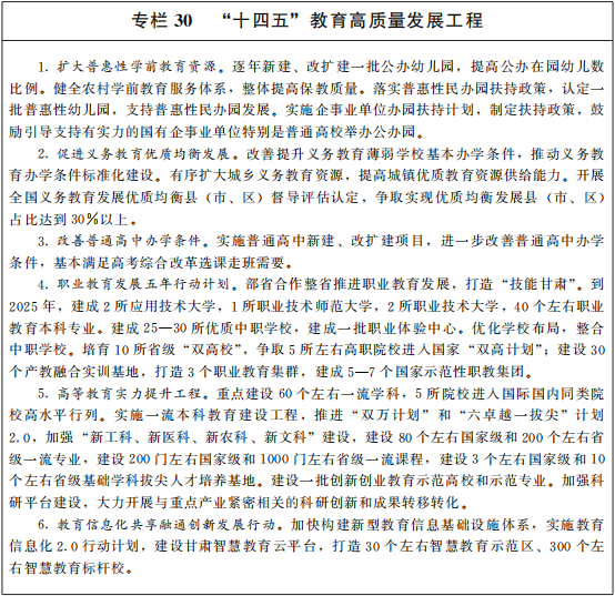 发展高质量教育。全面贯彻党的教育方针,坚持立德树人,加强师德师风建设,培养德智体美劳全面发展的社会主义建设者和接班人。深入实施教育强国推进工程,改善提升义务教育薄弱学校基本办学条件,合理配置城乡教育资源,大力促进教育公平。推动各级各类教育高质量发展,完善普惠性学前教育保障机制,实施普惠性学前教育资源扩容工程,扩大公办资源、支持和规范社会办园,加大学位供给。推进义务教育优质均衡发展和城乡一体化,到2025年九年义务教育巩固率达到97%以上。促进高中阶段学校多样化发展。鼓励各方力量参与兴办职业教育,支持兰州新区职教园区打造技能培训示范区,实现中等职业教育、高等职业教育和职业培训协调发展,构建纵向贯通、横向融通、学历教育与培训并重的现代职业教育体系,打造“技能甘肃”。实施高等教育振兴行动计划,支持兰州大学提升“双一流”建设水平,支持省内高校加强“双一流”建设。优化高校类型布局和高等教育学科专业结构,加强一流本科教育,加强理工农医类紧缺人才培养,提升研究生教育质量,推动实现高等教育高质量发展。支持和规范民办教育,完善特殊教育、专门教育保障机制。全面建设高素质专业化创新型教师队伍,改善乡村教师教学生活条件。持续提升乡村教育保障能力和水平,振兴乡村教育。完善家庭学校社会协同育人机制,深入推进“五育并举”,发展素质教育,重视青少年身体素质和心理健康教育,广泛开展体育、美育和劳动教育。提升教育国际合作交流开放水平。深化新时代教育评价改革,统筹推进育人方式、办学模式、管理体制、保障机制改革,提高教育治理能力和水平,推动形成高质量教育体系。
