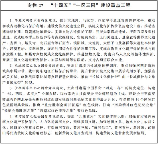 保护传承弘扬优秀传统文化。加快华夏文明传承创新区和长城、长征、黄河等国家文化公园甘肃段“一区三园”建设,重点推进管控保护、主题展示、文旅融合、传统利用“四类功能区”和保护传承、研究发掘、环境配套、文旅融合、数字再现“五大工程”建设。用好甘肃先祖、先贤、先河、先烈文化,实施优秀传统文化浸润工程,放大历史、人文资源价值。深度参与实施“中华文明探源工程”和“考古中国”重大项目,全面推进文化遗产系统保护。实施文化提升工程,系统挖掘整理甘肃历史文化、地域文化和少数民族文化,强化重要文化和自然遗产、非物质文化遗产系统性保护,加强各民族优秀传统手工艺保护和传承。弘扬敦煌文化,推动敦煌文献回归整理、保存修复、研究出版工作,把敦煌研究院建设成为世界文化遗产保护典范和敦煌学研究高地,巩固提升敦煌学研究话语权。实施革命文物保护利用工程和古籍整理工程。建设好红色文化教育基地。