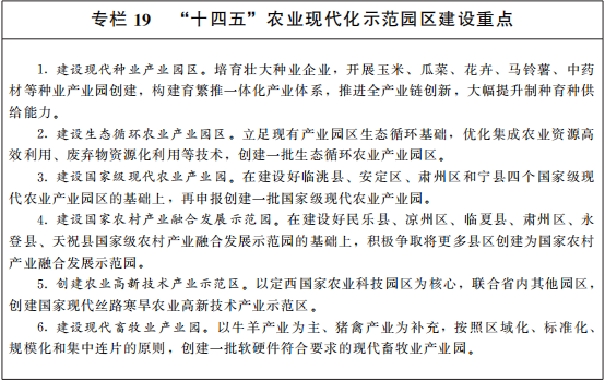 保障粮食安全。全省各级党委和政府必须扛起粮食安全政治责任,实行党政同责,全面落实保障国家粮食安全总体要求。坚持“藏粮于地、藏粮于技”,落实最严格耕地保护制度和承包耕地用途管制,有效遏制耕地非农化、非粮化,稳定粮食种植面积。积极发展全环节绿色高效技术和高端农业装备,加强农业水利设施和高标准农田建设,稳定粮食播种面积、提高单产水平。“十四五”时期,粮食综合生产能力稳定在1200万吨以上。深入推进优质粮食工程落地,做好粮食储备安全、物资储备保障、现代仓储物流、绿色智能管理等重点工作,完善粮食产销合作机制,提高粮食应急保障能力,建设省市县三级联动保障中心。在兰州新区建设辐射西北的粮油储运加工中心,发挥粮食进口口岸优势,争取建设粮食中转基地。完善重要民生商品价格调控机制,保障市场供应和价格总体平稳。
