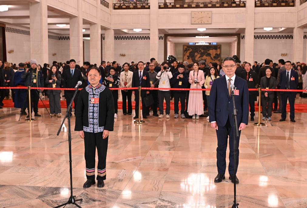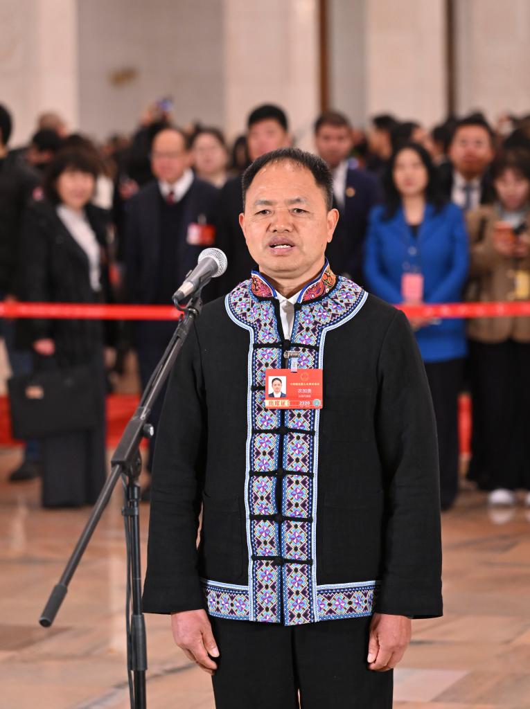 3月5日,第十四届全国人民代表大会第四次会议首场“代表通道”集中采访活动在北京人民大会堂举行。这是全国人大代表农加贵接受媒体采访。新华社记者 李鑫 摄