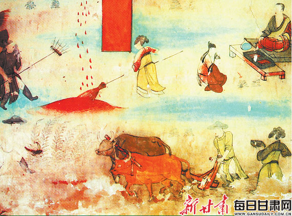 在敦煌莫高窟壁画中也有许多反映耕地、牛拉车等生活化的场景。