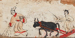 中国自古就是农业大国,在机械尚未发明时,牛是农民的“拖拉机”,它极大地增强和延长了人的双手。古人所说的地辟于丑就是地辟于牛;所谓辟地,就是耕地。早在春秋战国时,中国人就把牛用于耕田,至汉武帝时,搜粟都尉赵过创造了“代田法”,使牛耕得到推广,牛的地位越发重要,位居六畜之首,成为在人们生产生活中必不可少的帮手。在长达数千年的农耕社会中,它是人们亲密而又善良的朋友,人与牛共甘苦、同劳作,寄托着人生美好安定的向往。时至今日,我国部分农村仍有用牛拉犁耕田的传统习惯。耕牛负载农耕文化的事象,亘古一脉,源远流长。