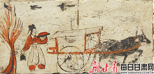 还有一幅《牛车出行图》描绘的是一人驾双辕牛车在前,牛和车轮均为黑色,一位挽髻、着红色交领上衣、下着长裙的女子,左手托盘,右手提罐,紧随步行。画面左侧有一棵树,树上落一只鸟,画面上方绘有两只飞鸟。画面反映了一派闲适的出行场面。