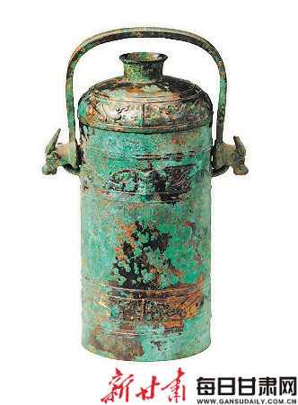 甘肃省博物馆藏的西周阝爰伯铜提梁卣,其器身呈筒形,有盖,盖顶有圈形捉手。扁条形提梁,梁面饰凤纹,提梁两端饰牛首,套接与器身半环钮上。盖缘与器身上下各饰一组长冠卷尾鸟纹,鸟纹上下有数道弦纹;器身上部对鸟纹间以浮雕兽面相隔。卣的用途与壶类似,也是盛酒用的器具。