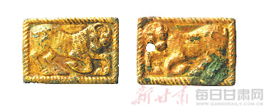 除了铜牌饰,还有战国时期的鎏金铜卧牛形牌饰、透雕虎噬牦牛铜带钩。平凉市博物馆藏鎏金铜卧牛形牌饰,文物整体作牛状,牛首枕于前蹄上,双角间作圆穿,尾部作条形穿,四蹄盘曲。脊、腹、腿局部以细斜线作毛状。正面通体鎏金,背面下凹,背面中部作两横梁,有条形穿。牛体肥硕,睡态安详。